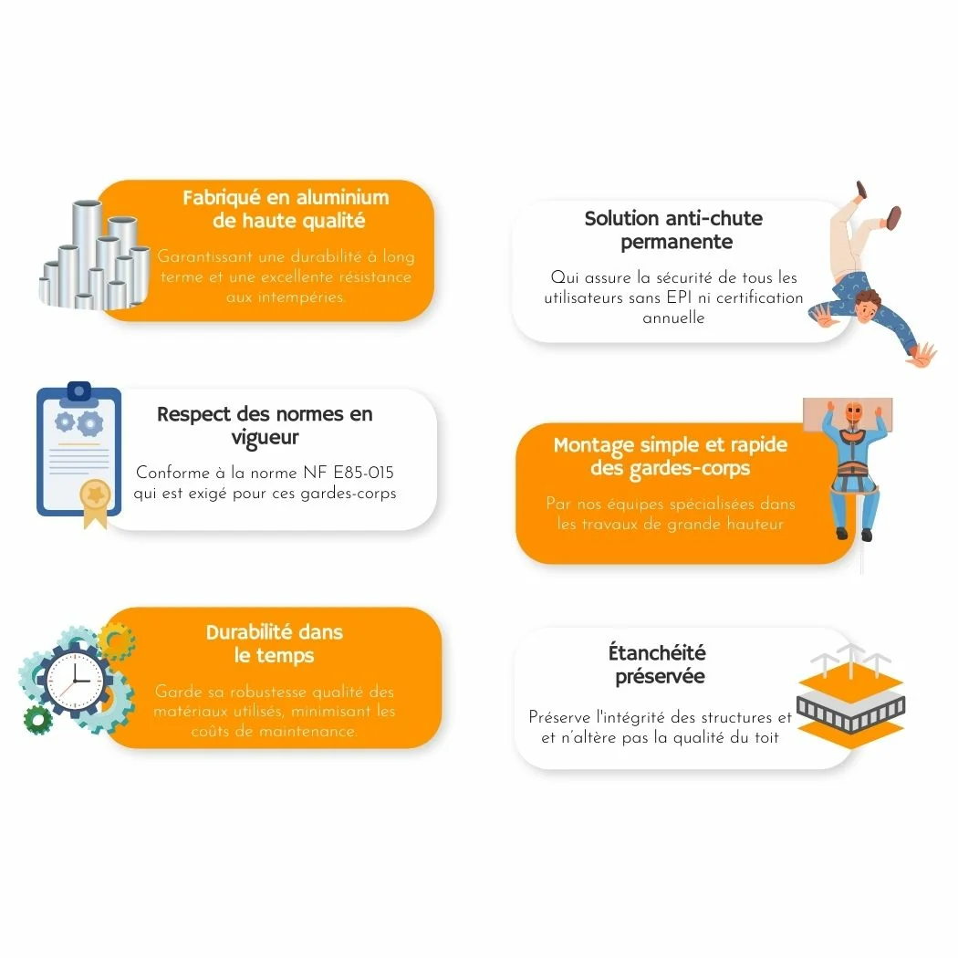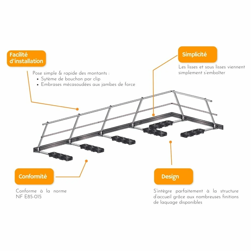 Nos garde-corps sont spécialement conçus pour protéger les toitures terrasses non accessibles au public. Ils respectent les normes EN ISO 14122-3 et NF E85-015, assurant une protection maximale contre les chutes. Avec une fabrication entièrement en aluminium de haute qualité, ils offrent une durabilité exceptionnelle, résistant aux intempéries et garantissant une sécurité continue sans besoin d’EPI ou de certifications annuelles. En choisissant nos garde-corps, vous bénéficiez non seulement d’une solution de sécurité robuste, mais également d’une tranquillité d’esprit durable pour tous vos projets en hauteur.